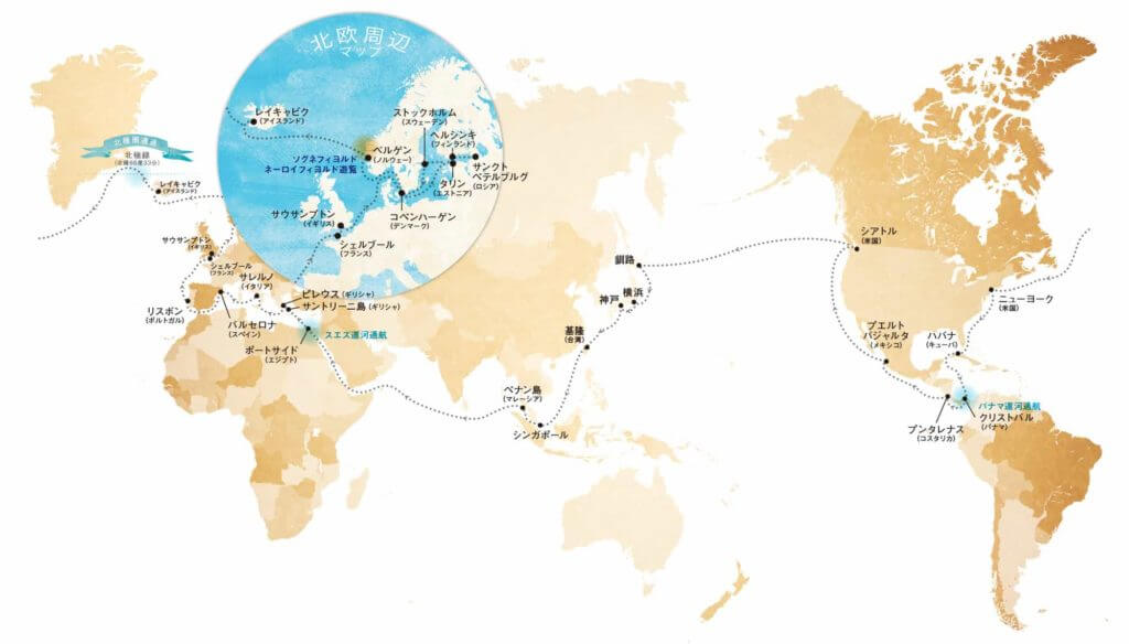 横浜→神戸→広州(中国)→シンガポール→クアラルンプール[ポートクラン](マレーシア)→マーレ(モルディブ)→スエズ運河通航→ポートサイド(エジプト)→サントリーニ島(ギリシャ)→ピレウス(ギリシャ)→ナポリ(イタリア)→モトリル(スペイン)→リスボン(ポルトガル)→ル・アーブル(フランス)→ロンドン[ティルベリー](イギリス)→ヘルシンキ(フィンランド)→タリン(エストニア)→ストックホルム(スウェーデン)→コペンハーゲン(デンマーク)→ベルゲン(ノルウェー)→ソグネフィヨルド遊覧→ノールフィヨルド遊覧→レイキャビク(アイスランド)→北極圏通過→ニューヨーク(米国)→カルタヘナ(コロンビア)→クリストバル(パナマ)→パナマ運河通航→プンタレナス(コスタリカ)→ アカプルコ(メキシコ)→バンクーバー(カナダ)→ケチカン(米国)→アラスカフィヨルド遊覧→スワード(米国)→横浜→神戸